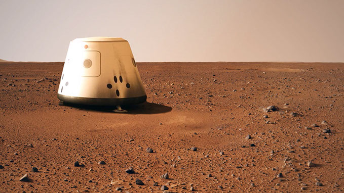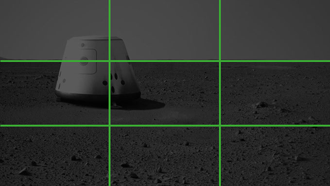 Die Drittel-Regel dient auch sehr gut dazu, den Horizont längs einer Linie zu platzieren. Auf dem Beispielbild kann man gut erkennen, dass die Horizontlinie gleich der oberen waagerechten Linie entspricht und das die Mitte der Marsstation auf dem oberen linken Schnittpunkt liegt. Der Bildaufbau bei diesem Beispiel zeigt außerdem, dass mit einer zwei-drittel Fläche die Marsoberfläche wichtiger erscheinen soll, als der Himmel über dem Mars.
